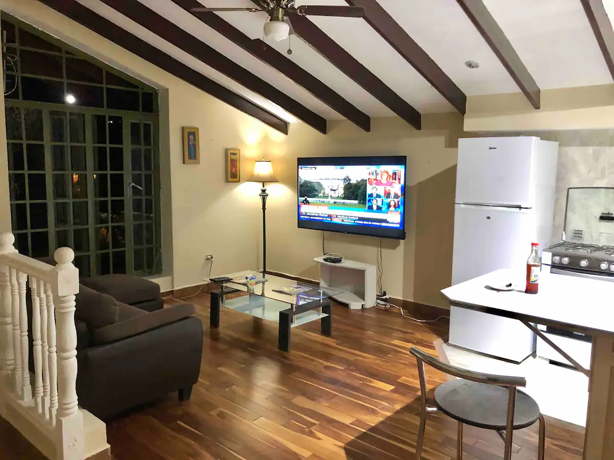 Studio appartement confortable d'une chambre. Cuisine complète avec coin repas à l'îlot avec 2 tabourets de comptoir hauts. Canapé-lit.